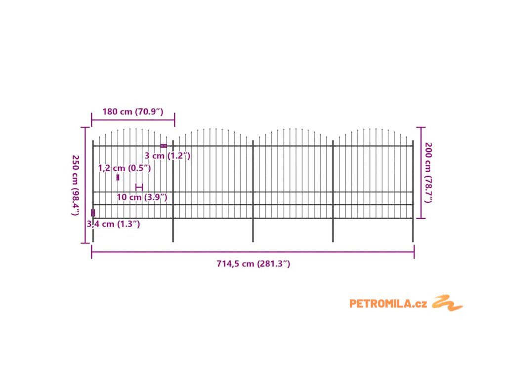 Zahradní plot s kopím nahoře ocelový 714,5 x 200 cm černý