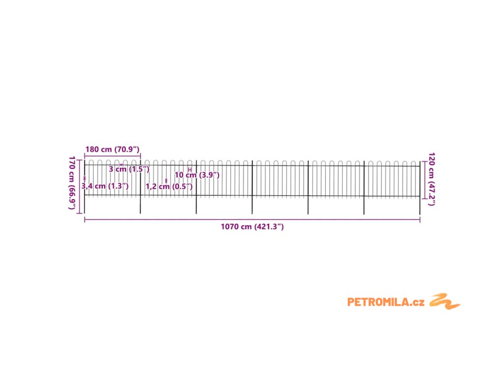 Zahradní plot s obloukem nahoře ocelový 1070 x 120 cm černý