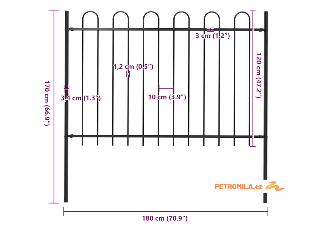 Náš zahradní plot tvoří svislé pruty nahoře zakončené obloučky a pevné vodorovné výztuhy, které rám zpevňují. Poskytuje vysokou míru zabezpečení. Plot, zhotovený z vysoce odolné oceli ošetřené práškováním, je výjimečně stabilní, pevný a dlouhodobě odolný. Jeho sestavení je snadné, veškerý montážní materiál je totiž součástí balení.