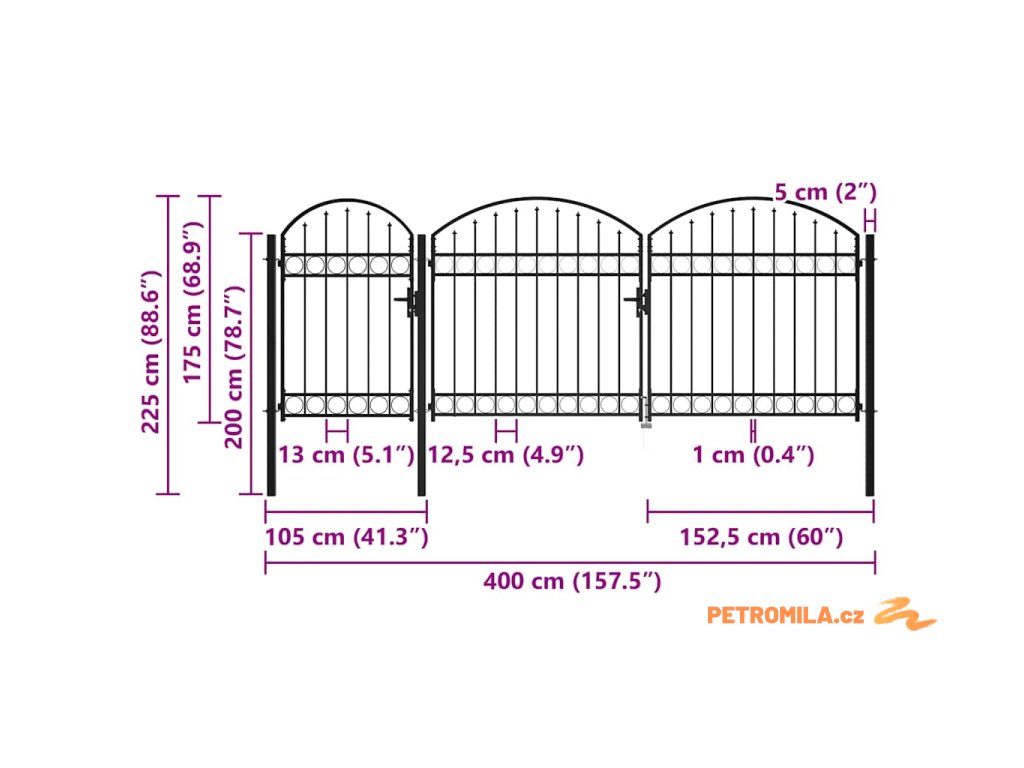 Elegantní zaoblený design naší brány je velmi atraktivní. Silné vodorovné výztuhy zpevňují rám, a zvyšují tak bezpečnost brány. Naše brána proto vytvoří nejen působivý vstup na váš pozemek, ale také spolehlivou bariéru. Je vyrobená z oceli a ošetřená práškovým lakem, který ji chrání před rzí a korozí. Zahradní brána je rovněž vybavená zámkem. Dodáváme ji spolu se třemi robustními sloupky s pevnými závěsy pro snadnou instalaci. Součástí dodávky je též zemní otočná zarážka, která umožňuje pro větší bezpečnost zajistit obě křídla brány na místě. Tato branka je skvělou kombinací stylu, pevnosti a stability!