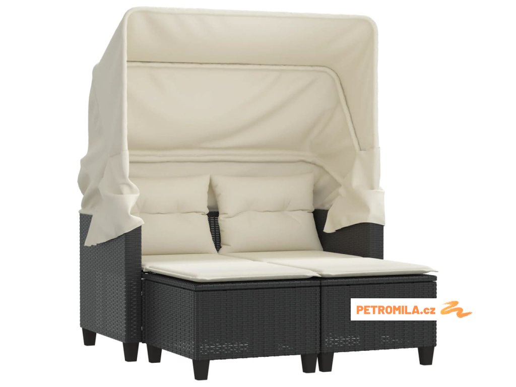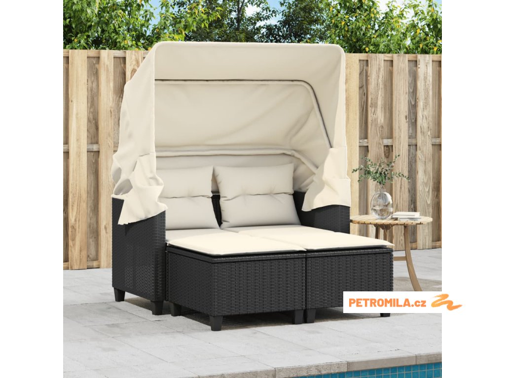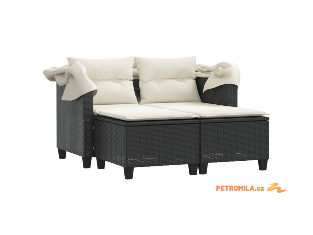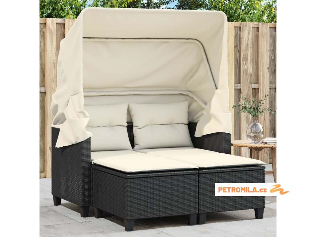 Zahradní pohovka 2místná se stříškou a taburety černá polyratan
