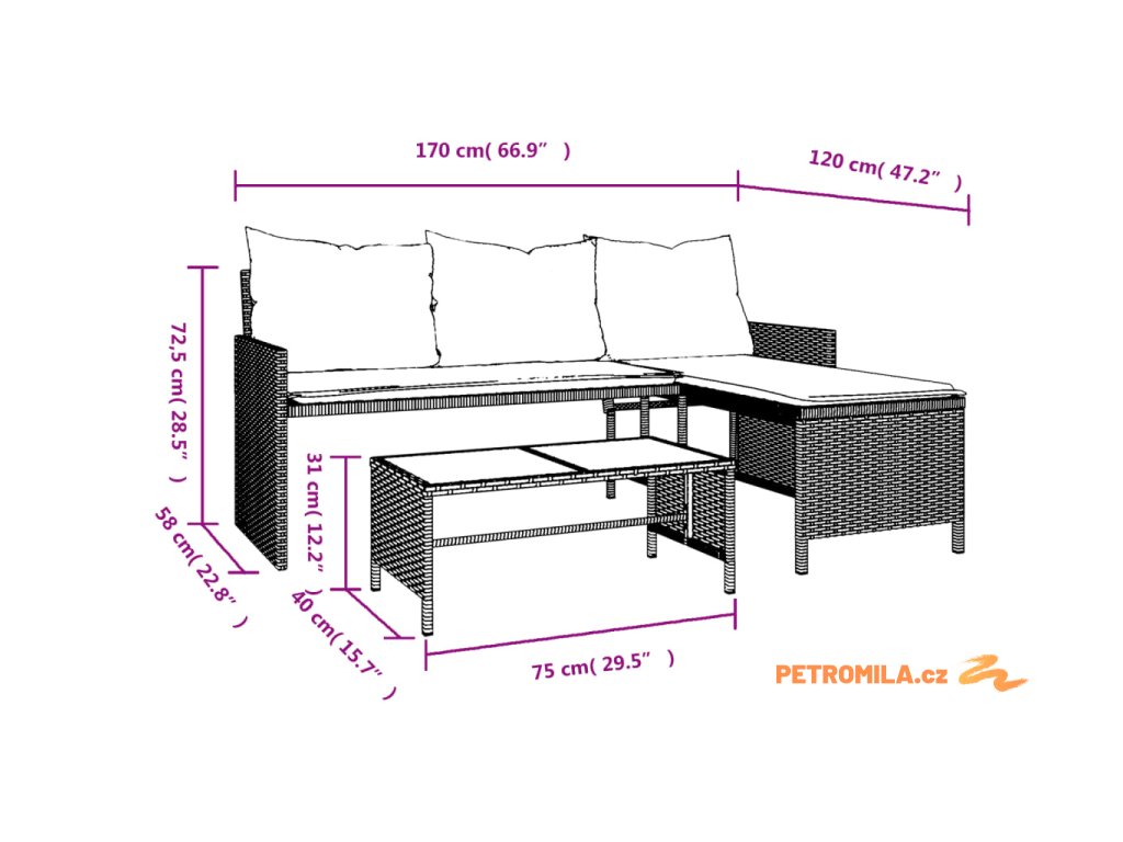 - Celkové rozměry: 170 x 120 x 72,5 cm (Š x H x V)