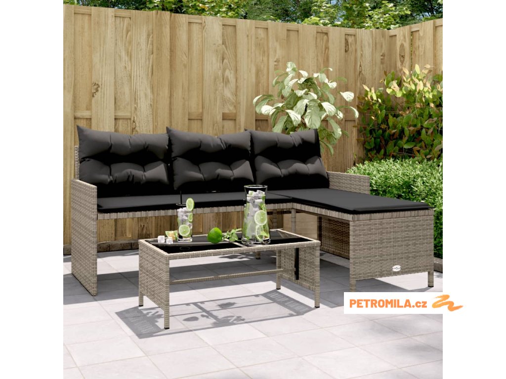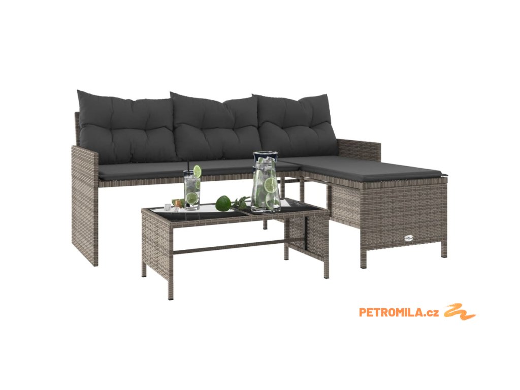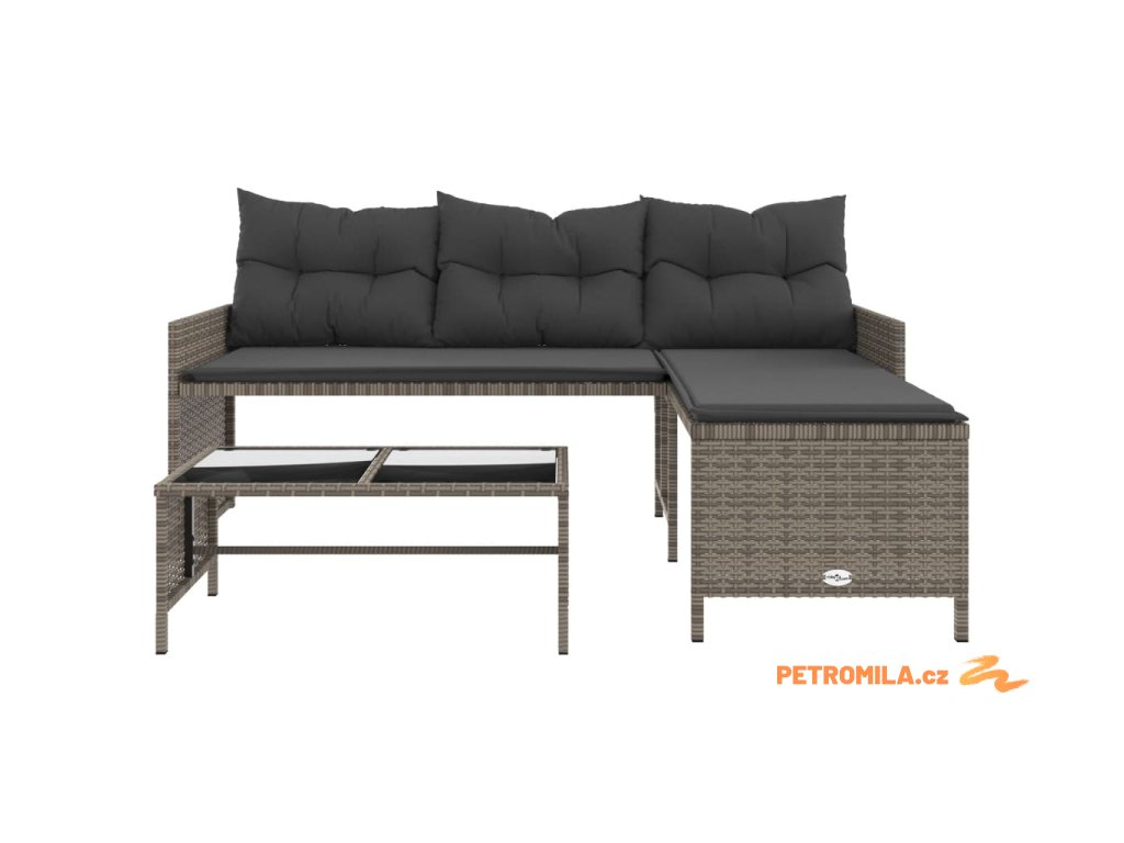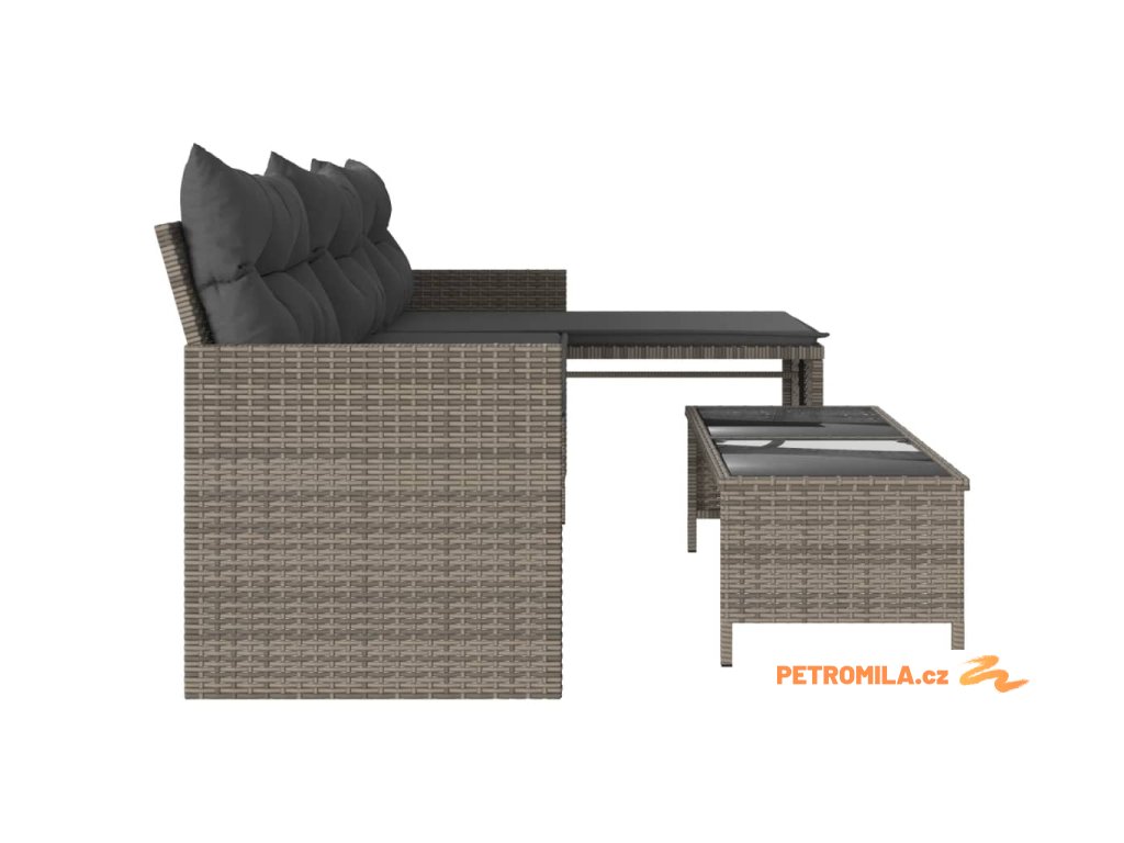 Zahradní pohovka ve tvaru L stolek a podušky šedá polyratan