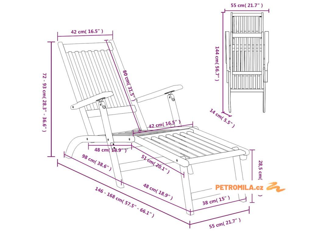 - Celkové rozměry (při úplném rozložení): 168 x 55 x 72 cm (D x Š x V)