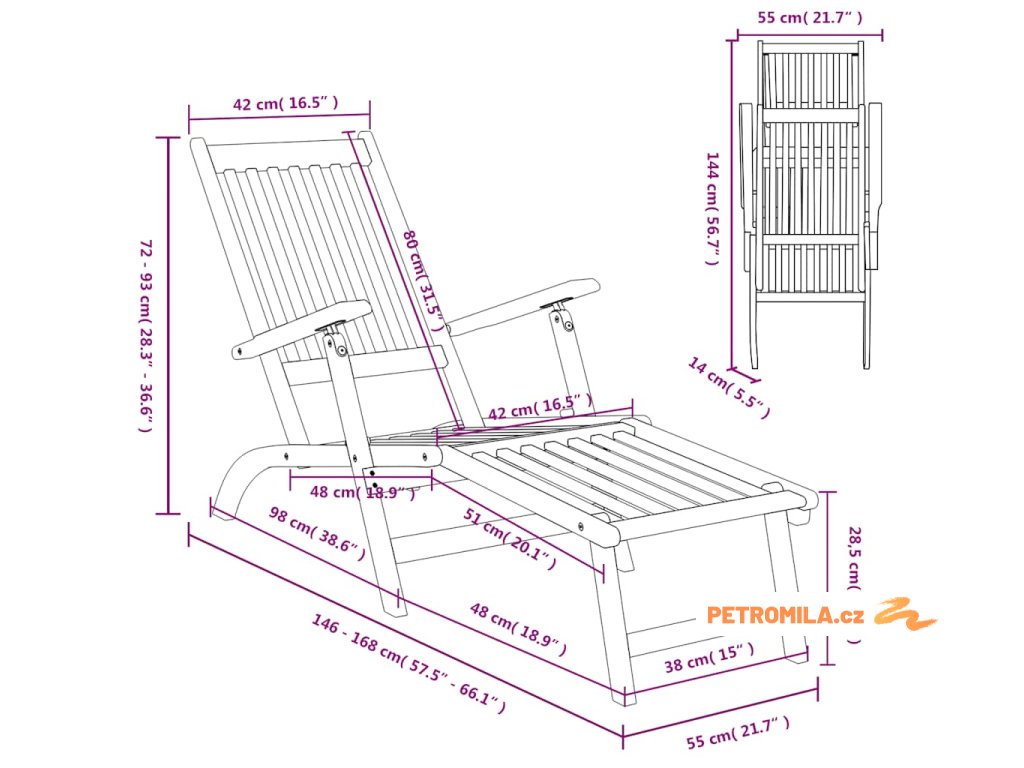 - Celkové rozměry (při úplném rozložení): 168 x 55 x 72 cm (D x Š x V)