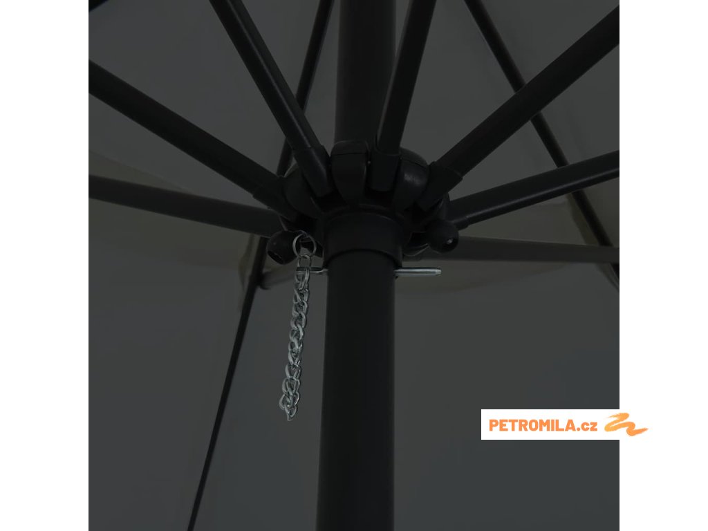 - Prvotřídní materiály: Tento deštník, vyrobený z kvalitního polyesteru, dává pevný stín před silnými slunečními paprsky. Ocelový rám ho drží stabilní venku, takže si můžete užívat relaxaci bez starostí.