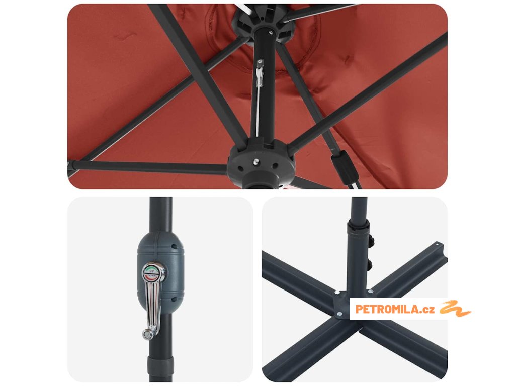 - Rám z práškově lakované oceli: Silný rám z práškově lakované oceli dělá deštník super stabilní a odolný. Jeho rezistentní povrch je skvělý pro dlouhé venkovní používání a odolává počasí.