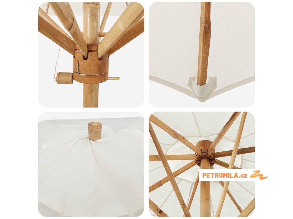 Skvělé materiály: Tento zahradní deštník vyrobený z kvalitního bambusu je robustní a skvěle vypadá, ideální do jakékoliv venkovní jídelny. Přírodní vzhled zajišťuje odolnost a vytváří hezkou atmosféru, kterou doplní různé zahradní styly. Polyester zaručuje, že se mu příroda bude vyhýbat, takže vám vydrží celé léto. Jednoduchá manipulace: Deštník má hladký kovový mechanismus pro snadné otevírání a zavírání. Můžete mít klid ohledně jeho stability, protože je navržen pro každodenní používání a bezpečně se drží na podstavcích i za větrných dnů. Snadný design znamená, že všechny části spolupracují pro pohodlný stín v zahradě či na terase. Estetický design: S stylovým a jednoduchým designem, deštník obohacuje jakýkoliv venkovní prostor. Přidává hezký prvek, který se hodí k různým nábytkům. Ideální na venkovní setkání, jídlo nebo relaxaci – je to univerzální volba pro váš zahradní styl. Účel: Tento deštník je stvořen pro venkovní zahrady a terasy, hlavně na léto, aby vám dopřál pohodlí během slunečných chvil. Skvělý pro každého, kdo chce relaxovat, číst nebo jíst venku ve stínu. Péče: Udržujte ho v dobrém stavu pravidelným otíráním měkkým navlhčeným hadříkem, abyste odstranili špínu a prach. Když ho nepoužíváte, uchovávejte ho na suchém a chráněném místě, aby byl materiál pořád v kondici. Trochu pravidelné péče pomůže deštníku dlouho vydržet, udržujíc ho užitečným a hezkým v vašich venkovních prostorách.- Barva: Krémově bílá