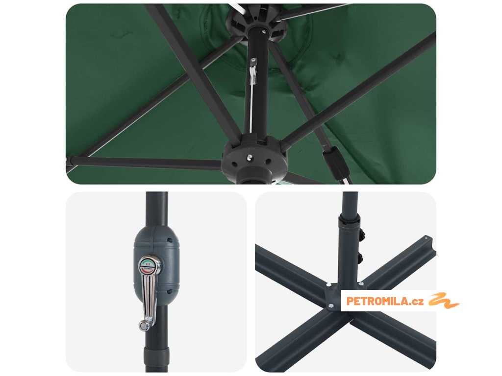 - Rám z práškově lakované oceli: Silný rám z práškově lakované oceli dělá deštník super stabilní a odolný. Jeho rezistentní povrch je skvělý pro dlouhé venkovní používání a odolává počasí.