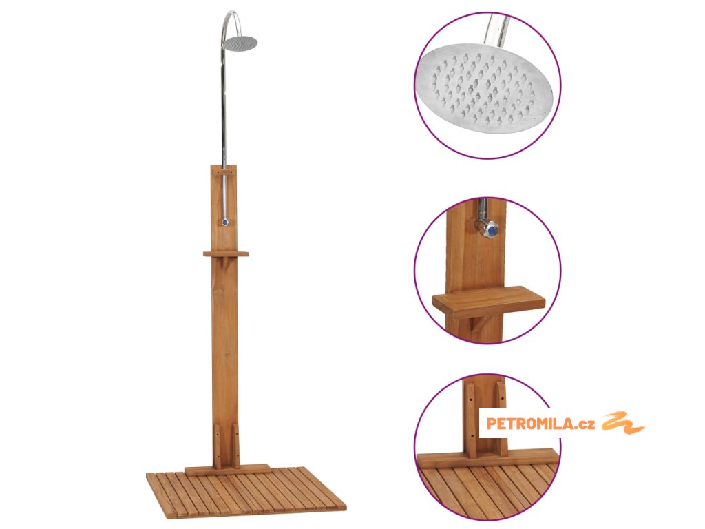 Zahradní sprcha je vyrobená z extrémně odolného teakového tvrdého dřeva, které je už vysušené, vyzrálé a jemně dohladka obroušené. Teakové dřevo je známé svou výjimečnou pevností a klimatickou odolností, takže je mnohem vhodnější pro zahradní nábytek a doplňky než jakýkoli jiný druh dřeva. Teakové dřevo je perfektní volba, pokud si chcete pořídit zahradní nábytek s dlouhou životností. Trubka je vyrobená z nerezové oceli, a proto je robustní a snadno se čistí. Zahradní sprcha, vybavená otočným knoflíkem a sprchovou hlavicí v ideální výšce, se snadno používá. Sprchový systém má širokou protiskluzovou základnu, takže je stabilní a poskytuje bezpečné místo pro sprchování. A své mýdlo a další sprchové potřeby si můžete uložit na poličku.