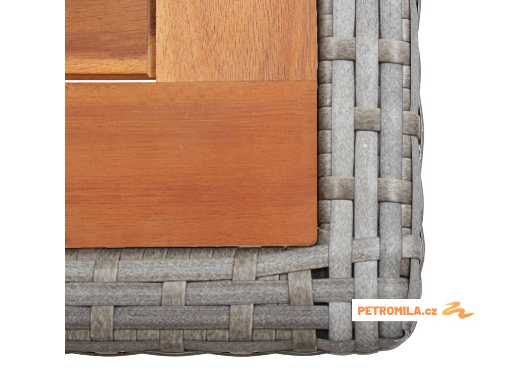 - Materiál: polyratan + ocel s práškovým nástřikem + deska z masivního akáciového dřeva