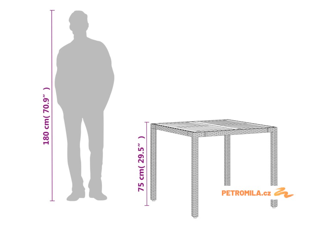 - Materiál: PE ratan, práškově lakovaná ocel, masivní akáciové dřevo s přírodní povrchovou úpravou