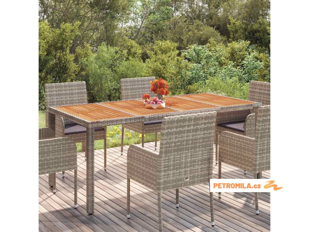 - Materiál: PE ratan, práškově lakovaná ocel, masivní akáciové dřevo s olejovou povrchovou úpravou