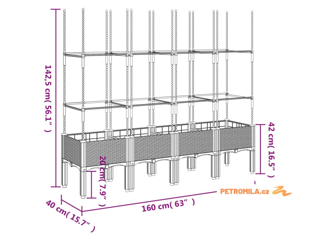- Praktický design: Ideální dno pomáhá zadržovat vlhkost a umožňuje snadný odvod vody. Vestavěná treláž navíc nabízí oporu pro růst popínavých rostlin, jako jsou rajčata, hrášek nebo růže.