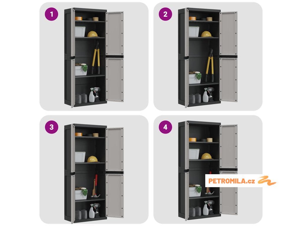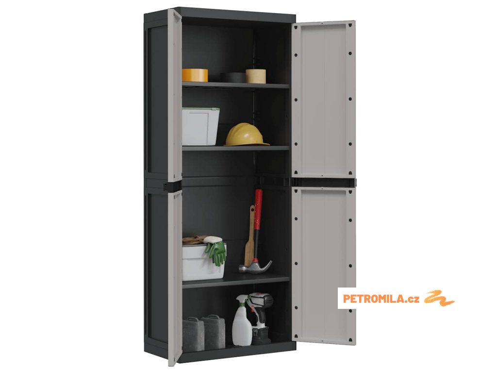 - Dostatek úložného prostoru: Tato skříň poskytuje dostatek úložného prostoru, který vám pomůže roztřídit zahradní potřeby, nářadí nebo jiné věci. Polici lze nastavit tak, aby se do ní vešly předměty různých velikostí.