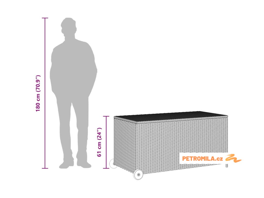 Úložný box z klimaticky odolného a solidního polyratanu je perfektní pro použití jak uvnitř, tak i venku. Tento box na podušky je vhodný pro uložení vašich podušek, polštářů, přikrývek a dalších věcí. Dřevěná rukojeť je napuštěná olejem a vnitřní vak chrání vaše věci před vlhkostí. Úložný box je navržený se 2 kolečky a rukojetí na jedné straně pro snadnou přepravu. Navíc se snadno čistí vlhkým hadříkem.