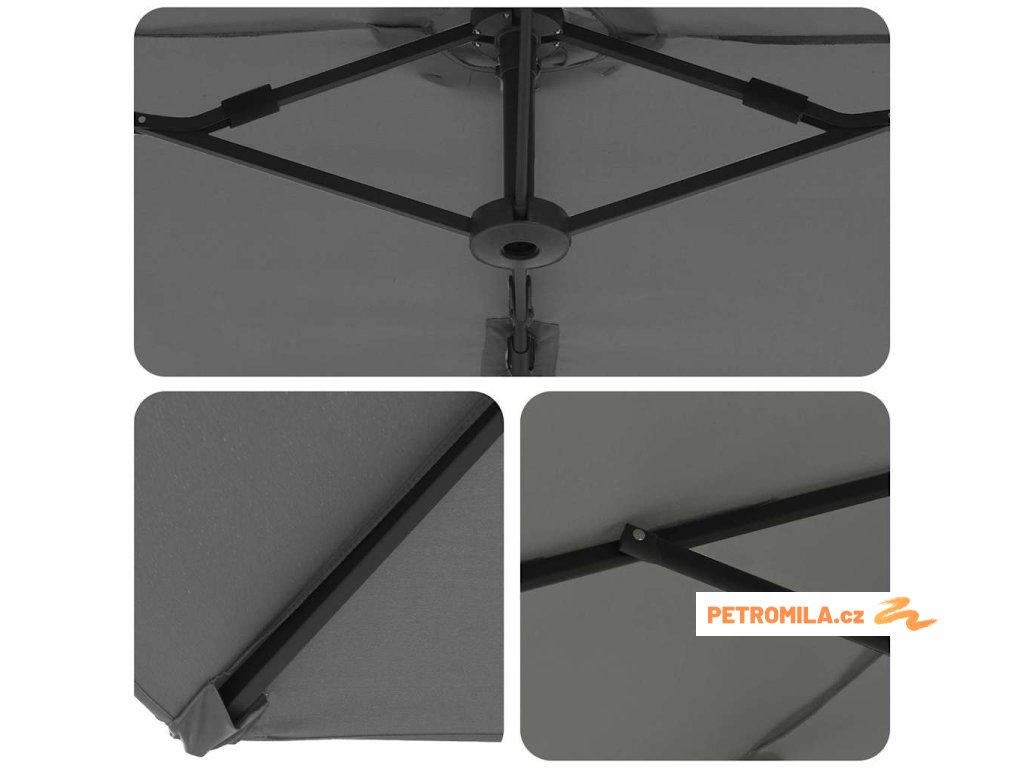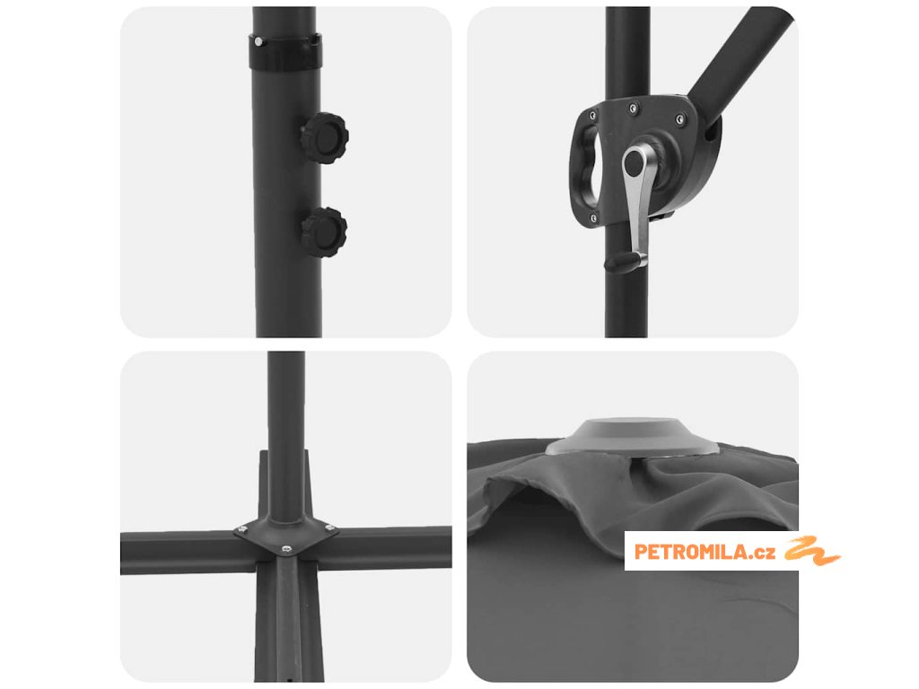 - Funkce / Design: Tenhle deštník kombinuje moderní styl s praktičností. Je navržený tak, aby vydržel venku, a jeho UV a voděodolné materiály ho činí ještě odolnějším. Konzolový design umožňuje maximální stín bez otravné tyče v cestě, takže prostor zůstává volný.