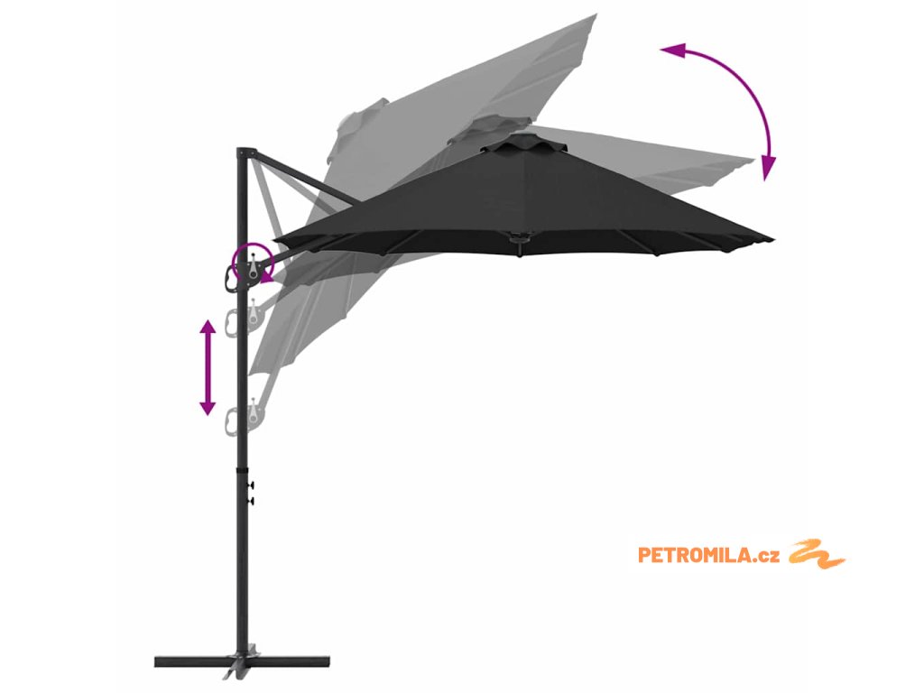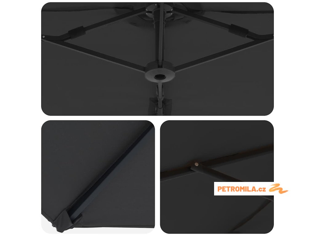 - Funkce / Design: Tenhle deštník kombinuje moderní styl s praktičností. Je navržený tak, aby vydržel venku, a jeho UV a voděodolné materiály ho činí ještě odolnějším. Konzolový design umožňuje maximální stín bez otravné tyče v cestě, takže prostor zůstává volný.