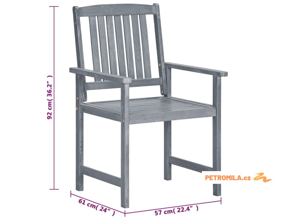 Zahradní židle jsou vyrobené z masivní akácie s povrchem zesvětleným do šeda. Jedná se o tvrdé dřevo s hustou kresbou. Masivní akáciové dřevo se vyznačuje schopností unést i velkou váhu a zároveň skvěle odolává opotřebení a působení času. Sada dřevěných židlí je stabilní, hodně toho vydrží a nepodléhá klimatickým vlivům. Jejich povrch se navíc snadno čistí navlhčeným hadříkem.