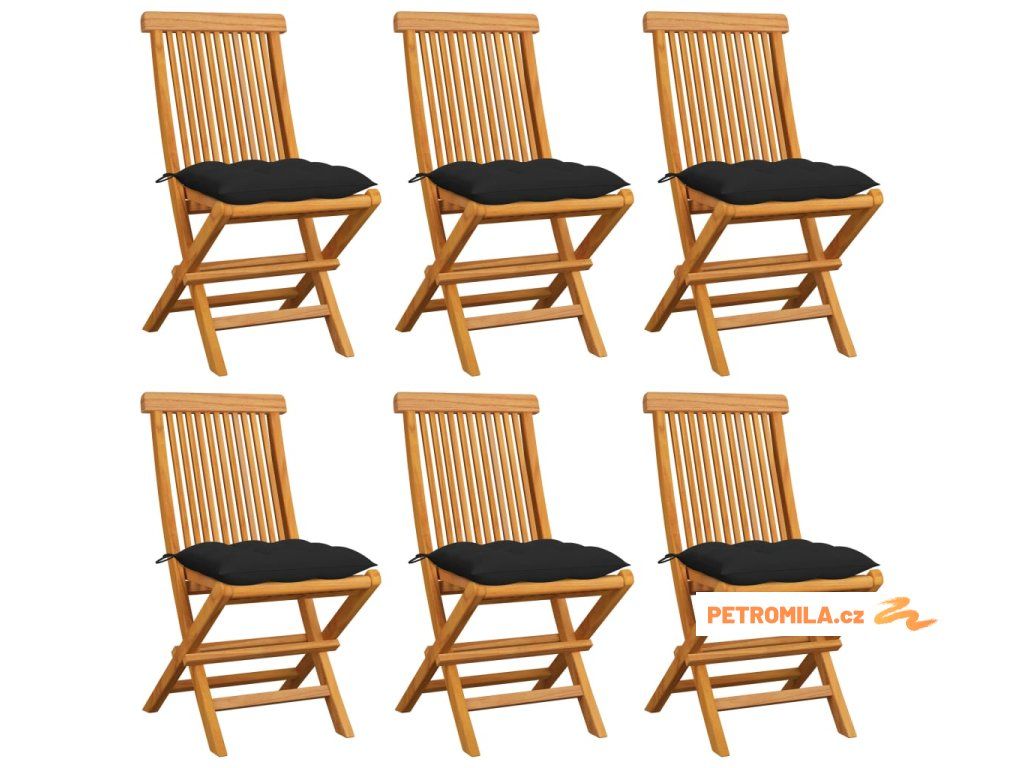 Zahradní židle s černými poduškami 6 ks masivní teak