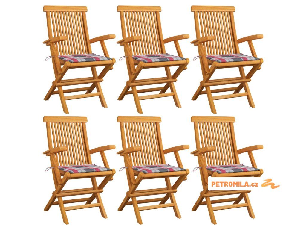 Zahradní židle s červeně károvanými poduškami 6 ks masivní teak