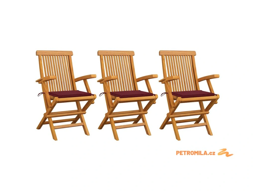 Zahradní židle s vínovými poduškami 3 ks masivní teak