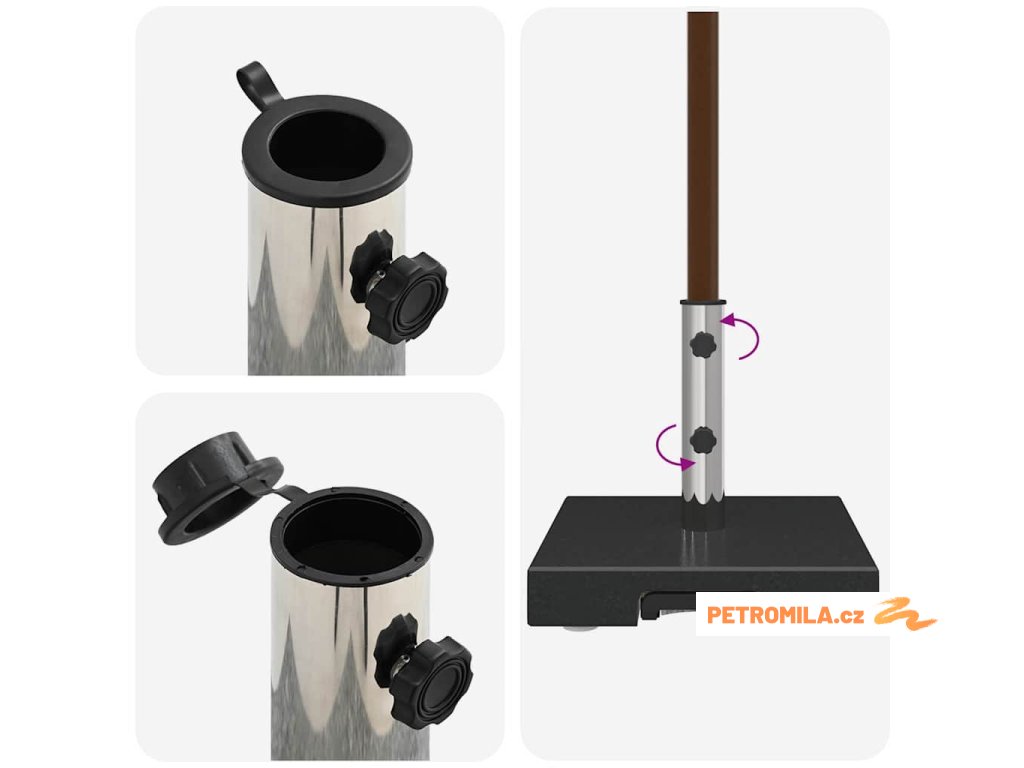 - Styl a Účel: Tato základna pro slunečníky má moderní vzhled, perfektně se hodí na slunné terasy a do zahrad. Její čisté linie jí dávají minimalistický vzhled, takže se hodí k různým dekoracím a zároveň udržuje slunečníky stabilní.