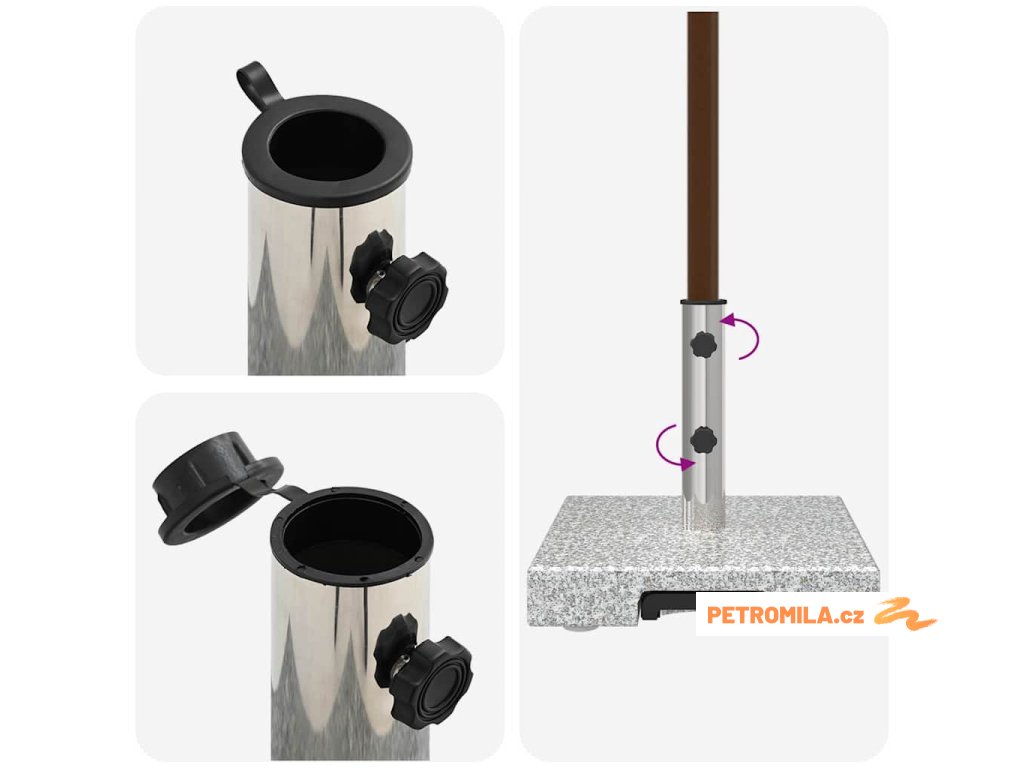 - Nerezová ocel: Nerezové komponenty dodávají potřebnou oporu a dlouhou životnost. To zaručuje, že slunečník si udrží moderní, elegantní vzhled. Kombinace žuly a nerezové oceli přináší praktický a stylový prvek do vaší zahrady.
