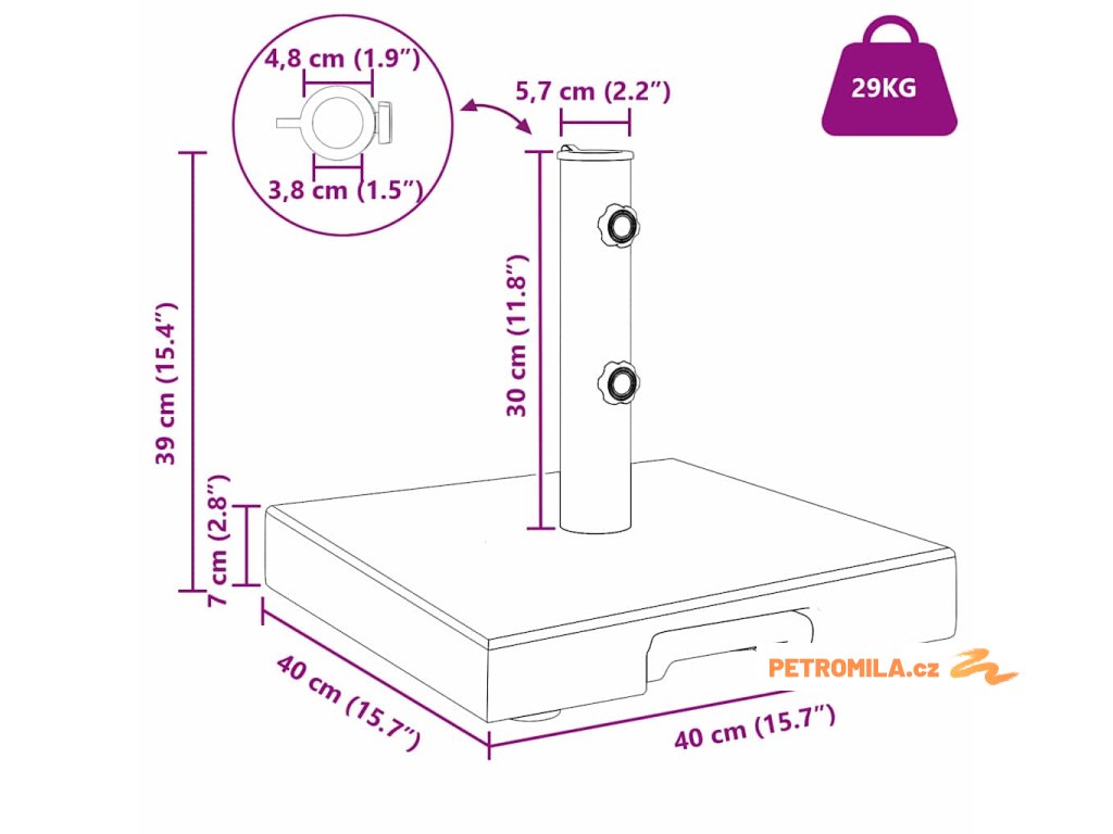 - Materiál žula: Tento stojan na slunečník je vyroben z kvalitní žuly, která je silná a odolná vůči povětrnostním vlivům. Žulový základ je připraven odolávat letnímu počasí, takže zůstane lesklý i v exteriéru. Díky robustnosti zajišťuje stabilitu a vypadá skvěle ve vaší zahradě.