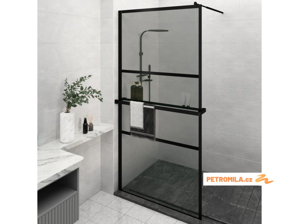 Zástěna do průchozí sprchy s policí černá 115x195 cm ESG/hliník