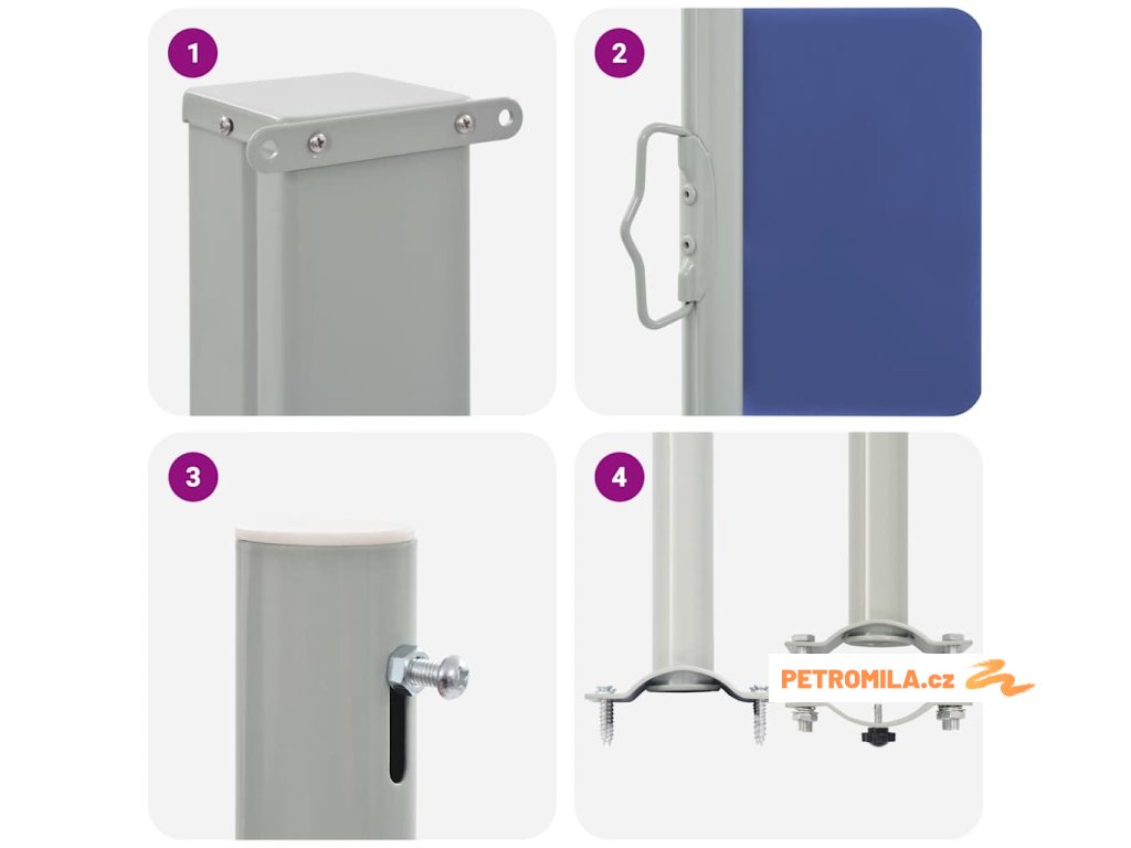 Zástěna je vyrobená z polyesteru, který je odolný proti UV záření a netrhá se. Kazeta, z níž boční markýzu snadno roztáhnete, je ve vertikální pozici posazená na bytelné ocelové základně. Markýza rovněž disponuje funkcí automatického srolování. Její sestavení je jednoduché.