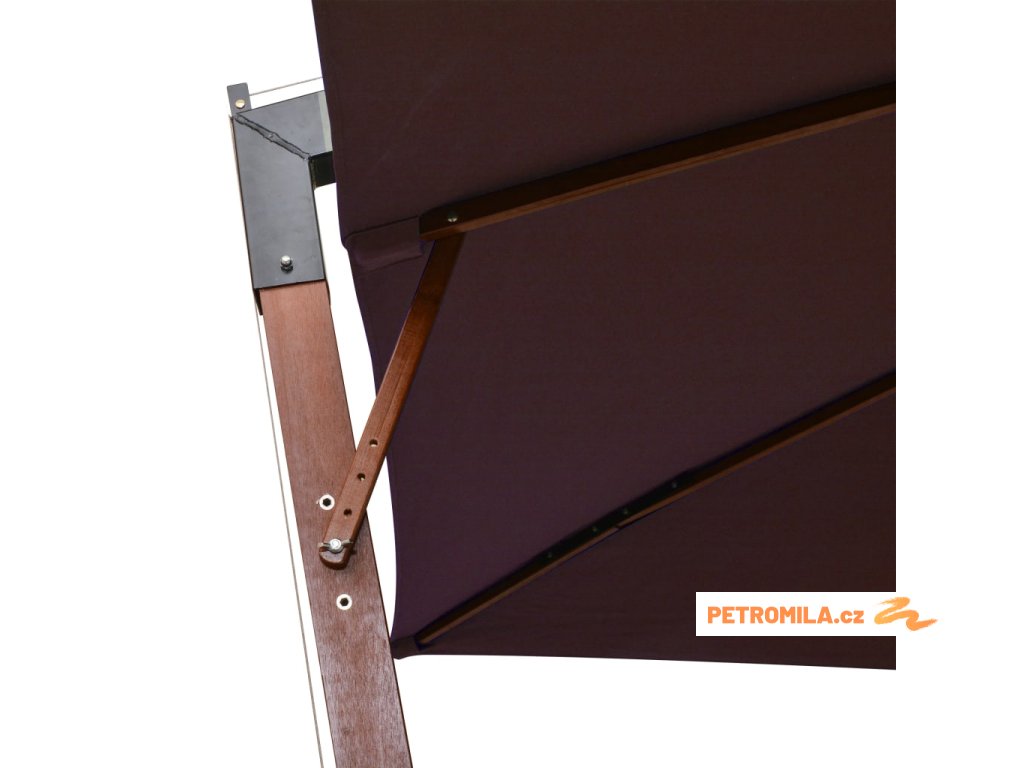 Střecha slunečníku je vyrobená z polyesterové tkaniny, která neztrácí barvu a je odolná vůči UV záření, takže zajišťuje optimální ochranu před sluncem. Slunečník má pevnou tyč z masivního jedlového dřeva, 8 odolných bambusových žeber a základnu ve tvaru kříže, je tudíž velmi stabilní. Stříška slunečníku volně visí z tyče, tyč proto nepřekáží v prostoru pod slunečníkem.