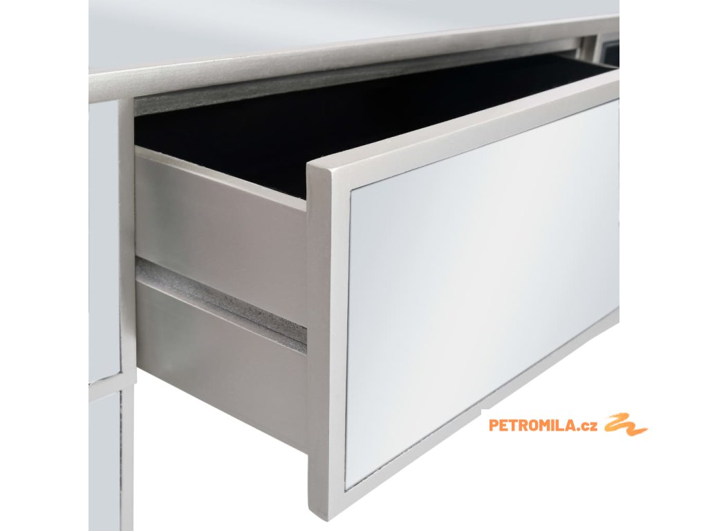Tento odkládací stolek je ozdoben elegantním zrcadlovým sklem a působí sofistikovaným dojmem. Rám stolku z MDF je pevný a odolný. Dvě zásuvky poskytují prostor pro přehledné uschování všech různých menších předmětů na dosah ruky. Knoflíky z umělého křišťálu podtrhují elegantní šarm stolku a usnadňují otevření zásuvek.