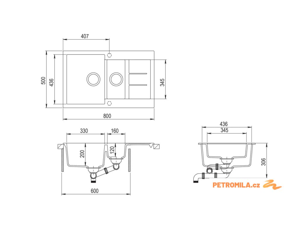 - Rozměry malého dřezu: 160 x 345 x 120 mm (D x Š x H)